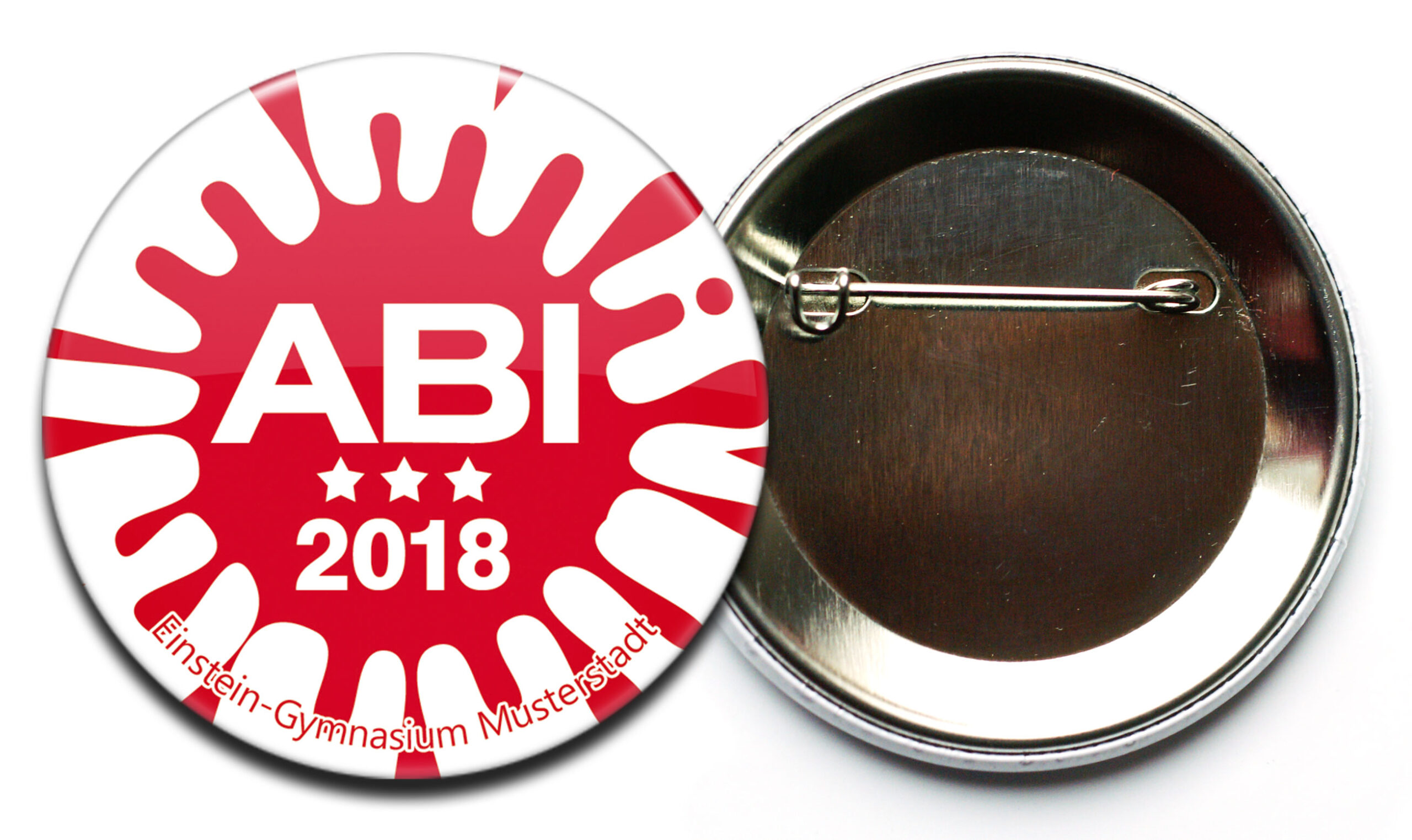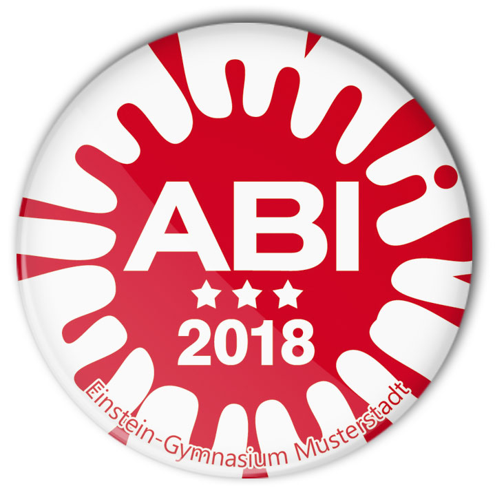 Ein zentraler roter Tintenklecks und darauf “ABI 2020, dekoriert von 3 Sternen – das ist das Abi-Button-Modell #2. Für die Bedeutung der roten Sterne könnt Ihr Euch eine Geschichte ausdenken :-). Oder sie stehen einfach dafür, dass Ihr genial seid 🙂