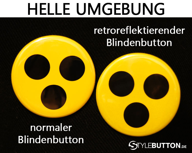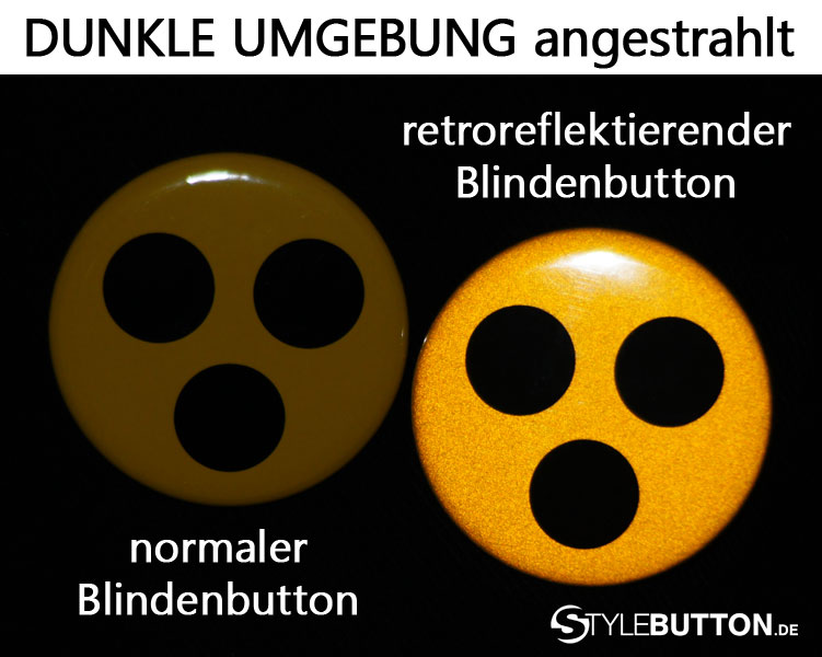 Buttons mit 3 schwarzen Punkten auf gelbem Untergrund sind deutschlandweit als Kennzeichnung für Sehbeeinträchtigung etabliert. Ziel ist, dass Verkehrsteilnehmer besondere Rücksicht walten lassen. Doch mit zunehmender Dunkelheit sind die üblichen Blindenanstecker immer schwerer zu erkennen. Zur Erhöhung der Sicherheit besitzen unsere reflektierenden Blindenbuttons deshalb eine besondere Schicht, die auftreffendes Licht von Fahrzeugen oder Fahrrädern reflektiert. So können andere Verkehrsteilnehmer das Blindenzeichen mit den drei Punkten bei schlechten Lichtverhältnissen leichter erkennen und entsprechend Rücksicht walten lassen.