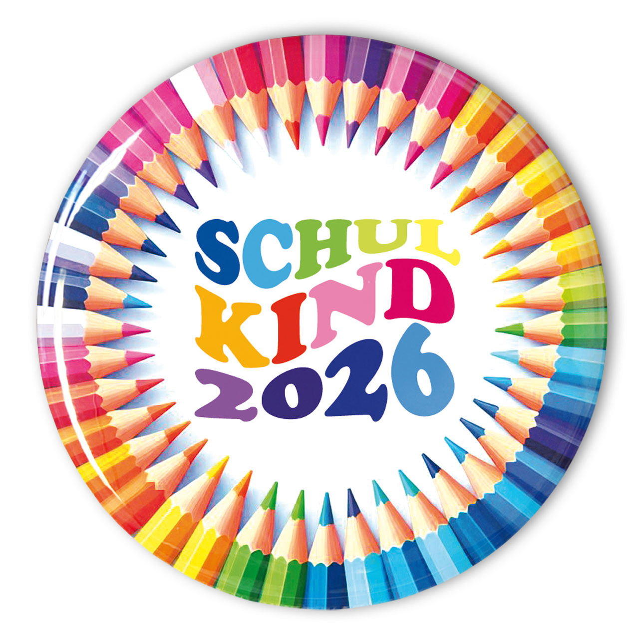 Das Motiv zeigt kreisförmig angeordnete Buntstifte, die den Blick auf das Zentrum lenken: den Schriftzug „Schulkind 2026“ in leuchtenden Regenbogenfarben. Dieses Design steht für Kreativität, Vielfalt und die spannende Reise, die vor den Kindern liegt.
