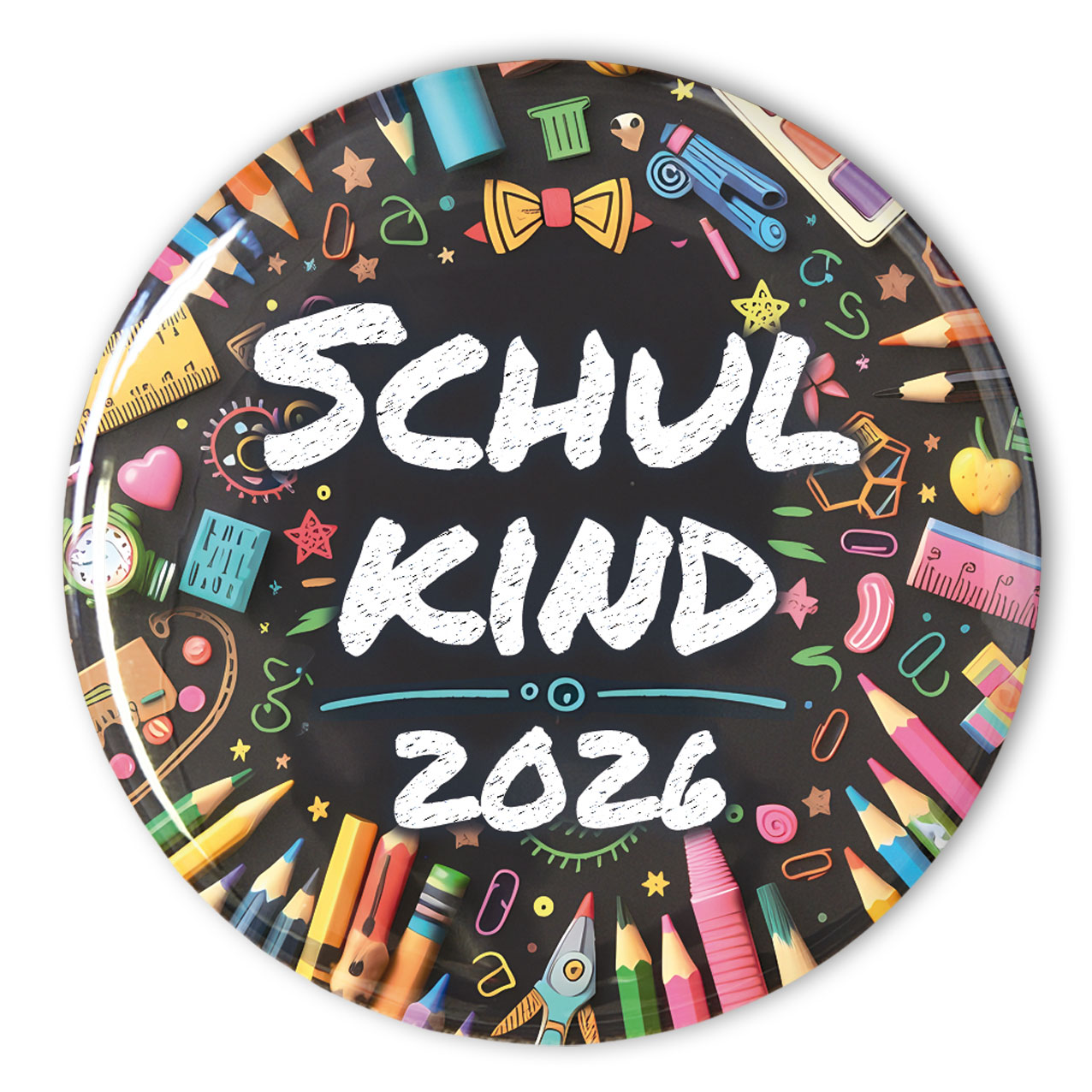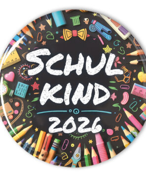 Das Motiv „Schulkind 2026“ kombiniert klare, weiße Schrift auf schwarzem Hintergrund mit liebevoll gestalteten Schulutensilien – ein starkes Symbol für den Start in einen neuen Lebensabschnitt.
