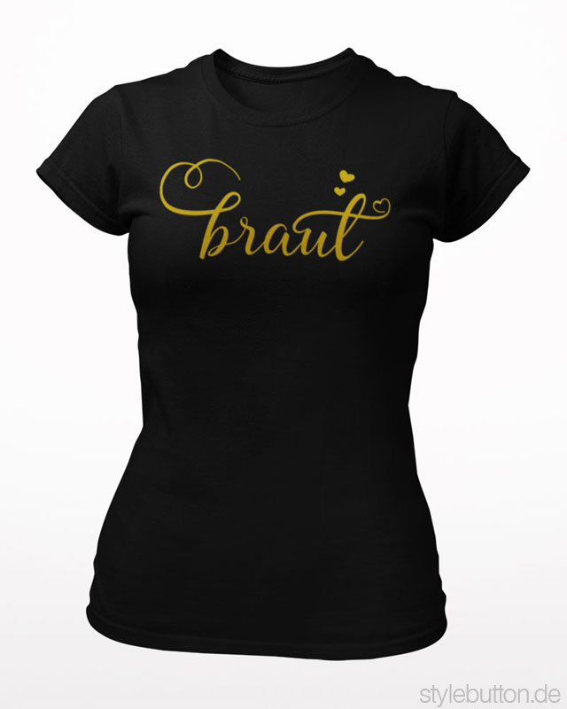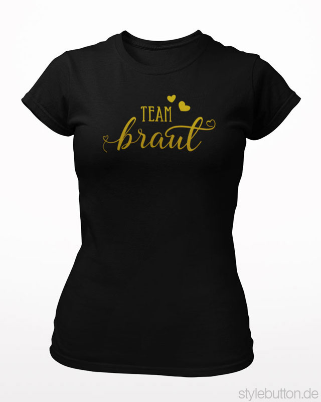 Unser JGA-Shirt Modell #27 wird von dem goldenen, romantisch-schnörkeligen Schriftzug “Braut” bzw. “Team Braut” für die begleitenden Personen beim Junggesellinnenabschied dominiert.