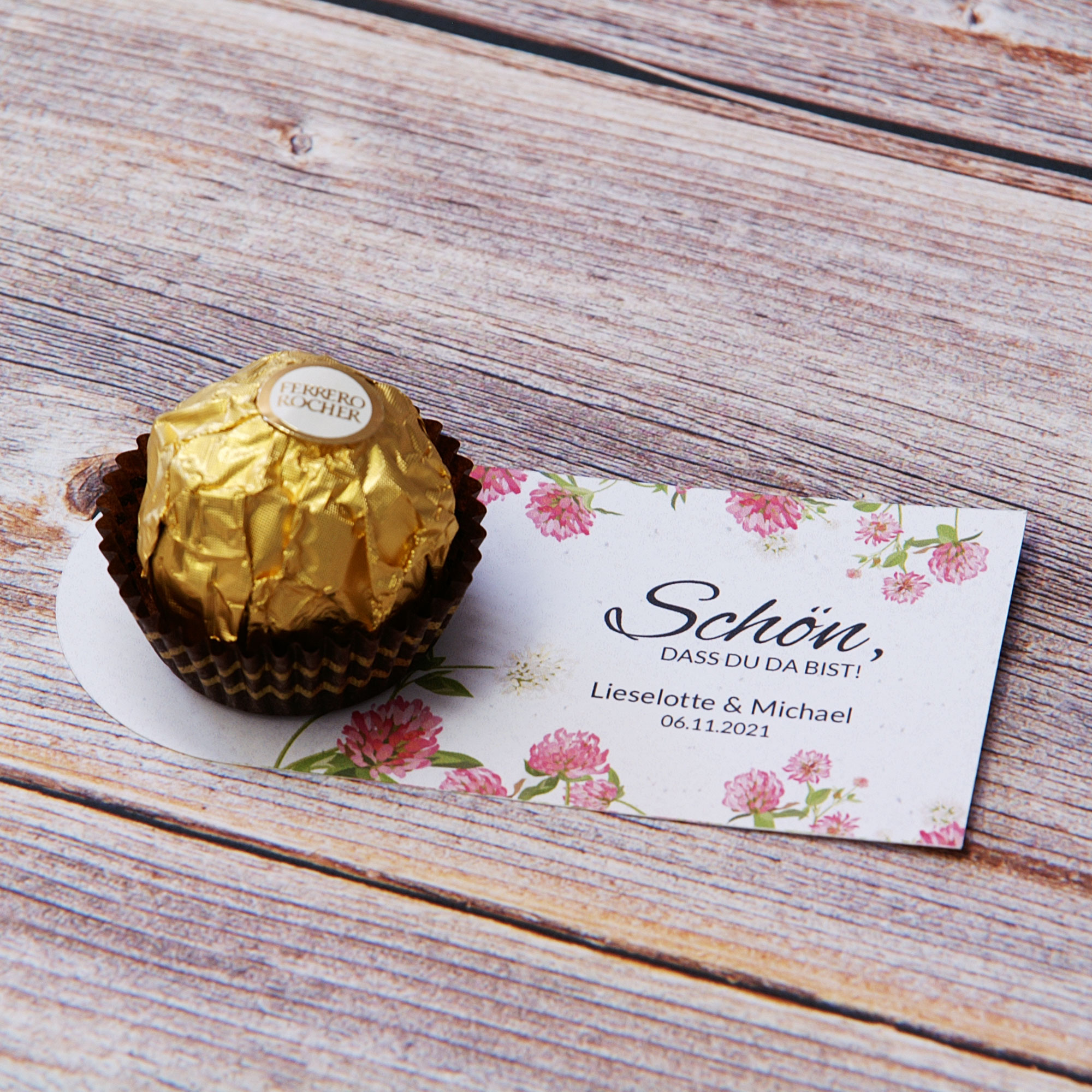Ein süßes Gastgeschenk für Gäste bei jeder Gelegenheit: eine leckere Praline auf einem personalisierten Kärtchen. Im floralen Design “Sommerklee”, der Name verrät es, mit grünen Kleeblättern und zartrosa Kleeblüten.
