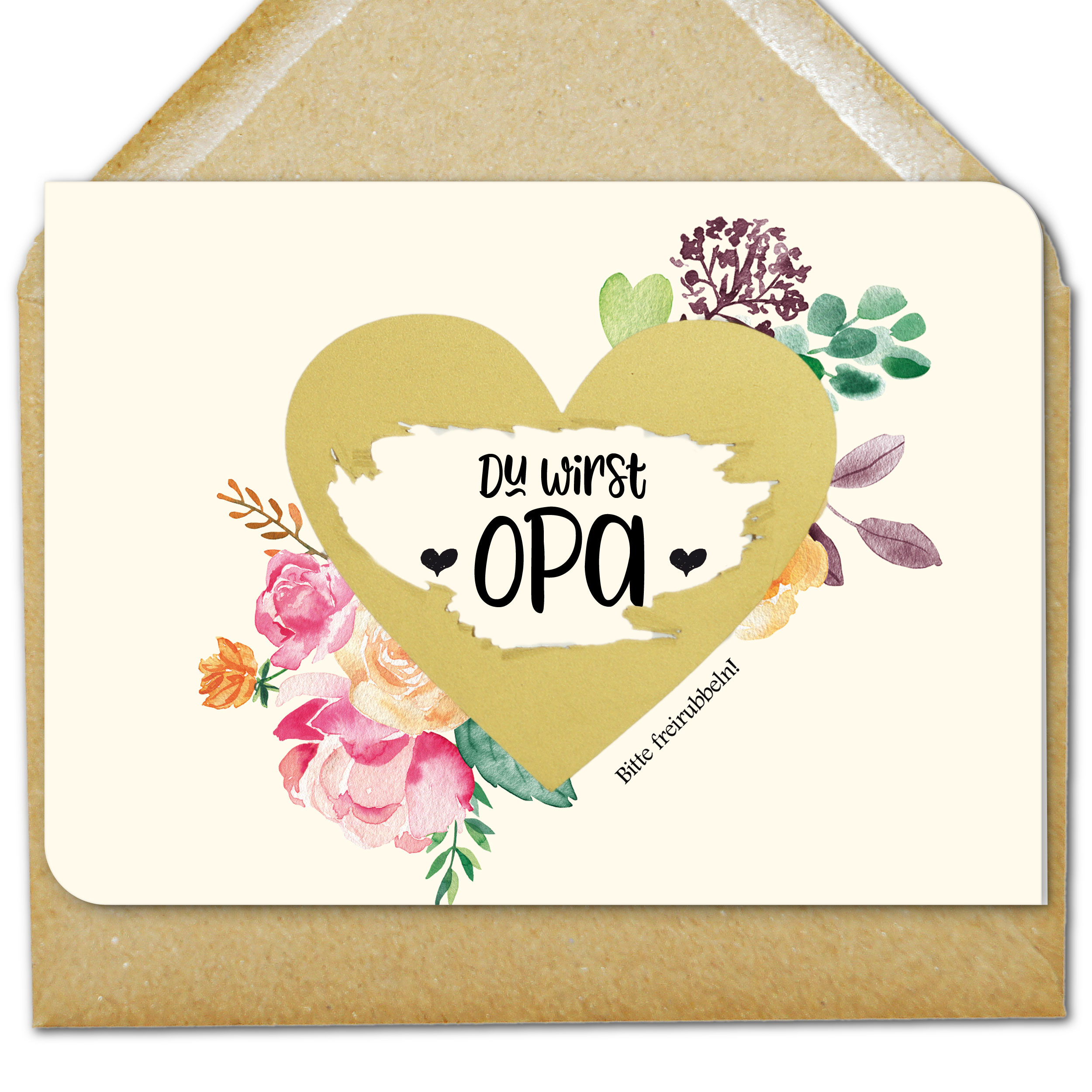 Unsere Rubbelkarte “Opa” ist eine wunderschöne Klappkarte mit einem goldenen Rubbelherz, hinter dem sich eine süße Botschaft verbirgt: “Du wirst Opa“. Damit überraschst Du Deinen (Schwieger)vati ganz bestimmt.